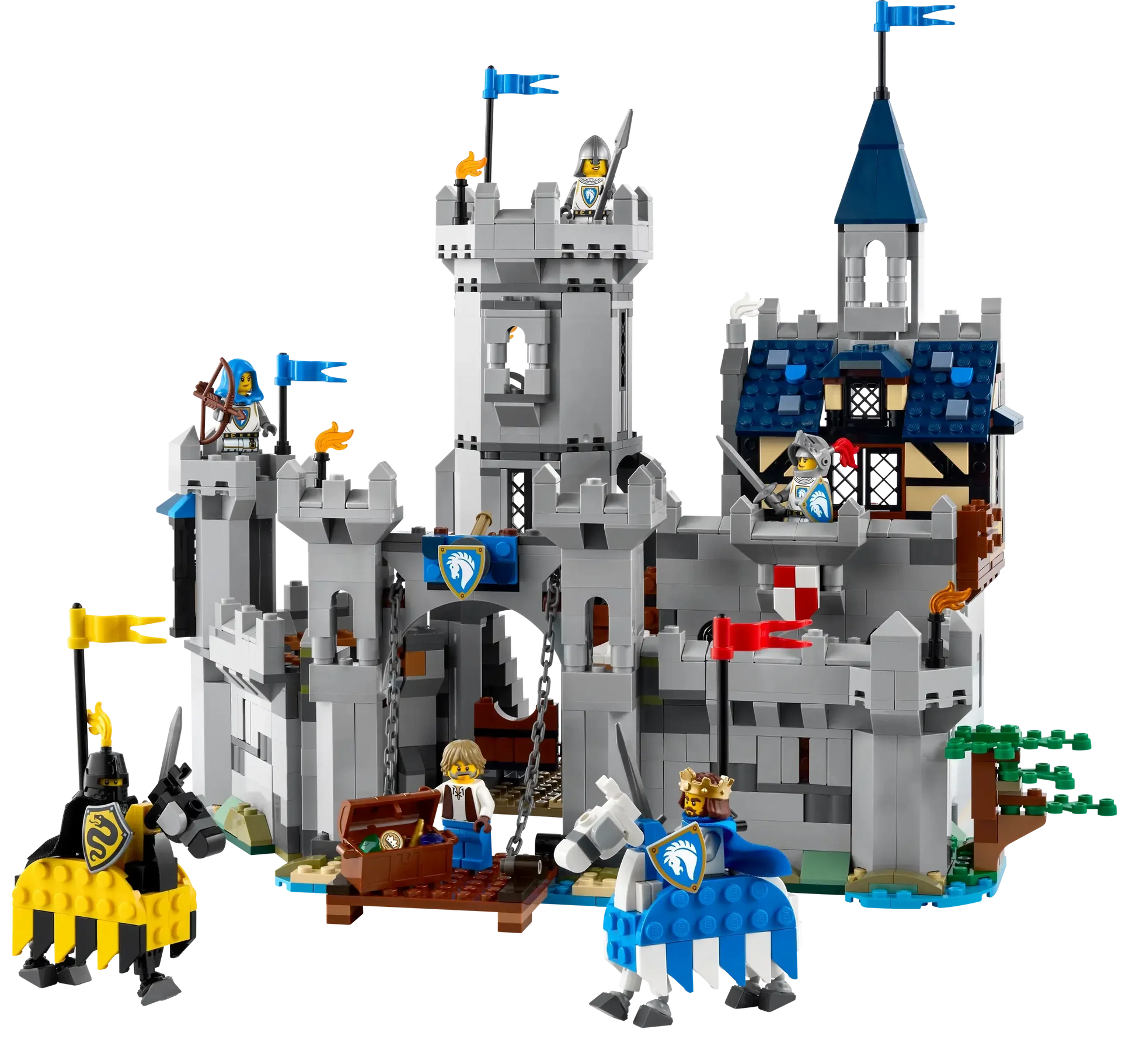 Boys and girls aged 9 and up have the choice of 3 different building options: an interactive castle playset, a jousting set with a small castle, or a medieval town playset with a windmill. Each playset comes with 6 minifigures: a horse knight king, horse knight champion, horse knight archer, horse knight spearman, blacksmith, and serpent knight, plus 2 posable horses.