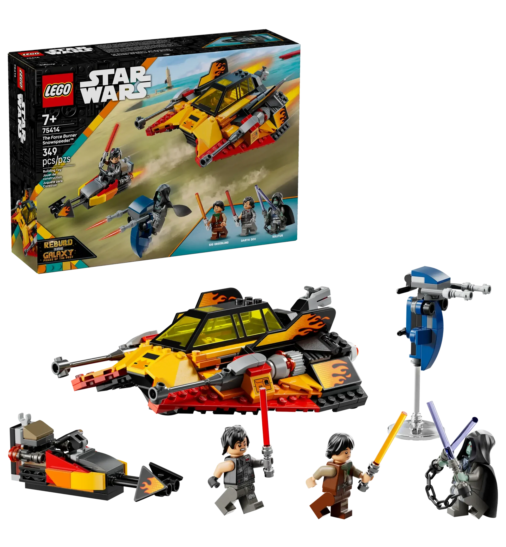 Gear up for fast action play with The Force Burner Snowspeeder (75414). This collectible building toy for kids, ideal for ages 7 and up, recreates the unique snowspeeder vehicle featured in LEGO® Star Wars™: Rebuild the Galaxy™ Season 2. Packed with fun features, it includes eye-catching flame decals, an opening double cockpit, a hidden detachable speeder bike, and a rear stud shooter.
